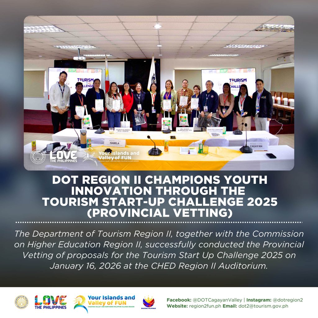 The Department of Tourism (DOT) Region 2, together with the Commission on Higher Education (CHED) Region 2, successfully conducted the Provincial Vetting of proposals for the Tourism Start-Up Challenge (TSC) 2025 on January 16, 2026 at the CHED Region 2 Auditorium, Tuguegarao City, Cagayan.