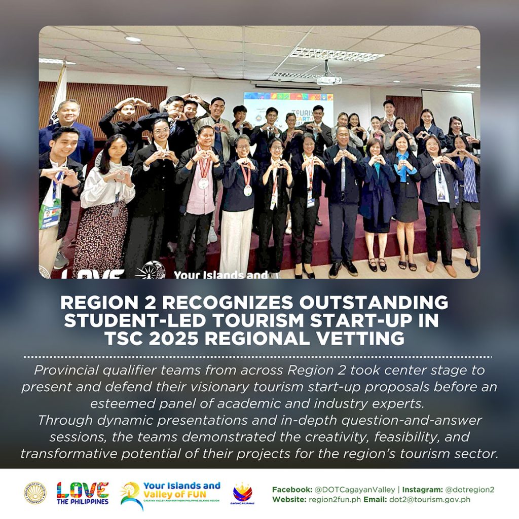 iThe Department of Tourism (DOT) Region 2, in collaboration with the Commission on Higher Education (CHED) Region 2, convened the Tourism Start-Up Challenge (TSC) 2025 Regional Vetting on 11 February 2026 at the CHED Region 2 Auditorium in Tuguegarao City, Cagayan. The event brought together top provincial qualifier teams composed of college students from tourism and other academic disciplines, showcasing interdisciplinary collaboration in developing innovative tourism start-up concepts.